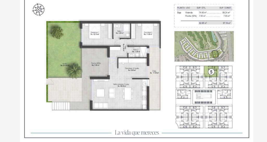 De beganegrondwoningen beschikken over een privétuin en een gezellige achterpatio, ideaal om buiten te ontspannen. De bovenwoningen bieden ruime terrassen, een dakterras (solarium) en een zomerse buitenkeuken, vanwaar u kunt genieten van spectaculair uitzicht op de bergen en de indrukwekkende golfbaan.