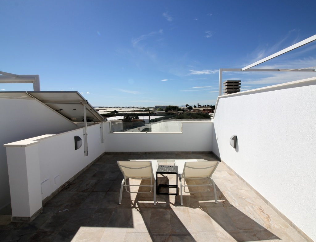 Aan de achterzijde beschikt elke woning over een privéterras met eigen parkeerplaats. Op het dakterras bevindt zich een groot solarium dat extra buitenruimte biedt, ideaal om het hele jaar door van de zon te genieten, een chill-out ruimte te creëren, te barbecueën of zelfs een jacuzzi te plaatsen.