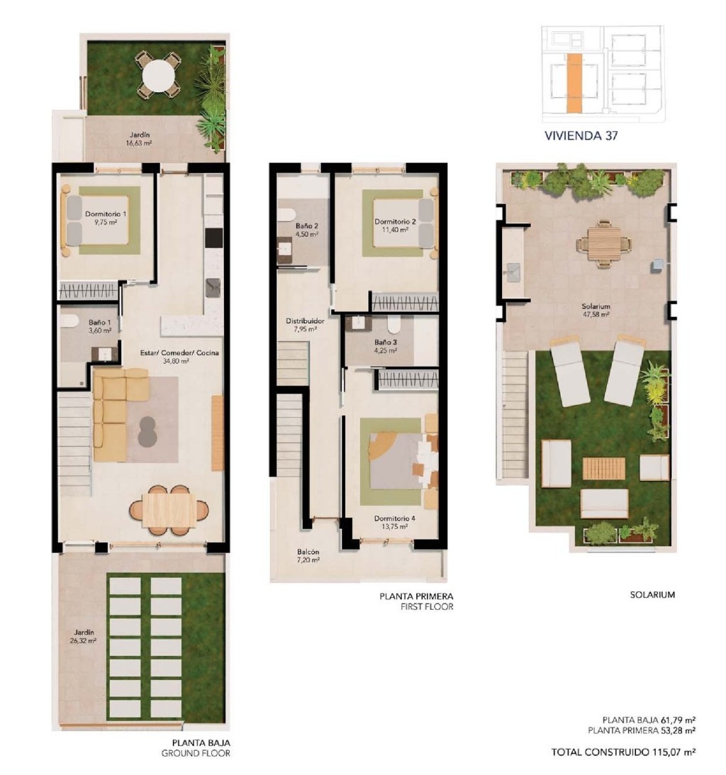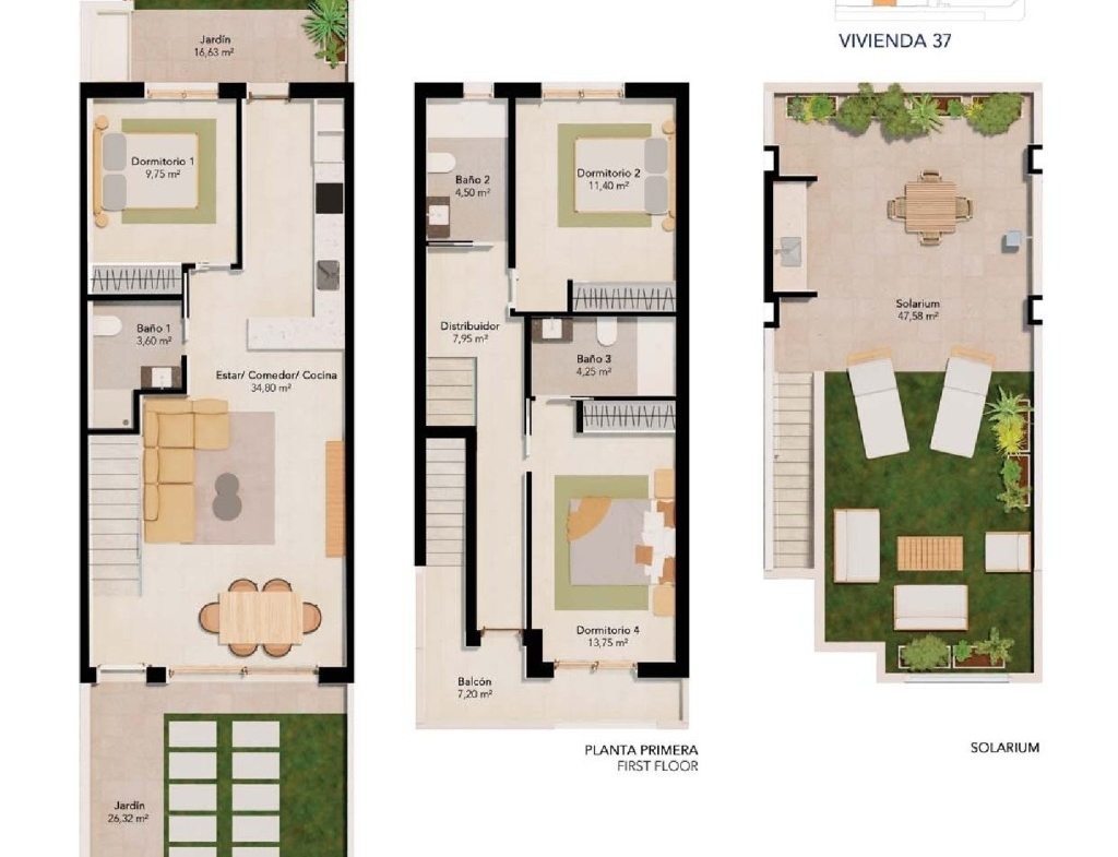 Elke woning beschikt over 3 ruime slaapkamers en 2 complete badkamers, evenals een open keuken die uitkomt op een lichte woon- en eetkamer. Vanuit de woonkamer is er directe toegang tot de uitnodigende gemeenschappelijke zwembadzone – de perfecte plek om te ontspannen en te genieten met familie en vrienden.